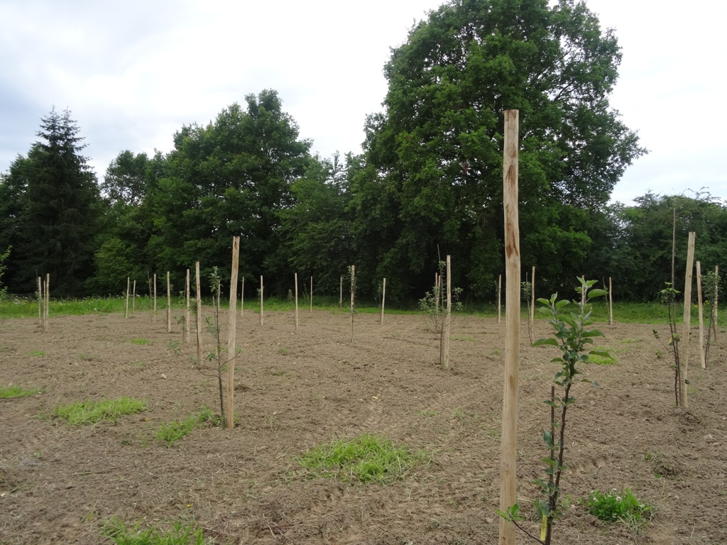 Ils ont ensuite procédé à la plantation d’arbres greffés et les ont tuteurés avec des piquets en châtaignier. Le verger rassemble une cinquantaine d’arbres fruitiers, tous de variétés anciennes et différentes, pommiers, poiriers, pêchers, pruniers et cerisiers dont les appellations ne manquent ni de poésie ni d’originalité : Reinette Clochard, Roselette, Calville Rouge, Poire Curé, Docteur Guyot, …