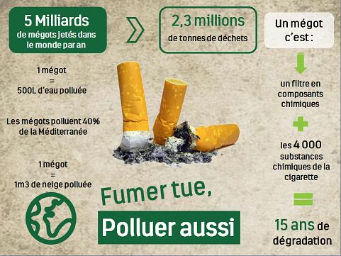 Un mégot absorbe environ 4000 substances nocives présentes dans les cigarettes : monoxyde de carbone, ammoniac, hydrocarbures, goudrons, produits radioactifs, métaux lourds, additifs, méthanol, acide cyanhydrique, ... !