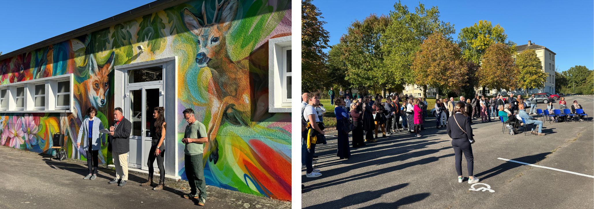 Le mardi 14 octobre, Sêma LAO a achevé la fresque en ajoutant le logo des 100 ans de l’APSAH. L’inauguration a donc pu se tenir ce même jour en présence des usagers et salariés de l’ESRP et de l’ESPO, des salariés du siège, des trois directrices ainsi que des administrateurs et adhérents de l’association. L’événement a débuté par les discours du président de l’APSAH, Monsieur François BOUHET, du formateur de la section « ouvrier de production horticole » Pierre JUGE et de l’artiste, Sêma LAO, avant de se poursuivre par un goûter, offrant à tous l’occasion de se retrouver et d’échanger autour de cette réalisation artistique.